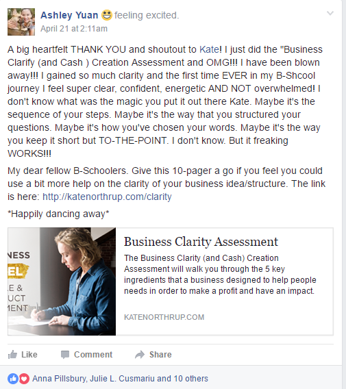 That’s why I’ve created a free Business Clarity (and Cash) Creation Assessment for you. It will walk you through the 5 key ingredients that a business designed to help people needs in order to make a profit and have an impact.